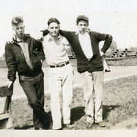 - A photograph of three Pacific University students standing next to a football field. One of them is holding a clipboard. There are bleachers visible in the background. This photograph appears in an album that was compiled by Edith Hansen McGill, a 1930 Pacific University graduate.