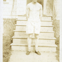 - A photograph of a male Pacific University student standing in front of the stairs to an unidentified building. He is wearing a tank top and shorts. This photograph appears in an album that was compiled by Edith Hansen McGill, a 1930 Pacific University graduate.