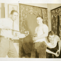 - A photograph of three male Pacific University students messing around with a plunger. This photograph appears in an album that was compiled by Edith Hansen McGill, a 1930 Pacific University graduate.