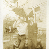 A photograph of a group of male Pacific University students. They are posing under a wilted umbrella. Three of the students are on their hands and knees. Two students looks on from the background. This photograph appears in an album that was compiled by Edith Hansen McGill, a 1930 Pacific University graduate.