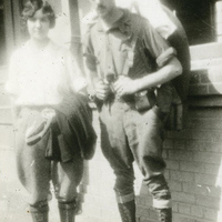 - A photograph of two Pacific University students dressed in knickerbockers and boots. One student is wearing a large backpack. The pair appear ready for a hike. This photograph appears in an album that was compiled by Edith Hansen McGill, a 1930 Pacific University graduate.
