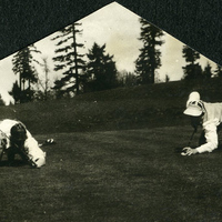 - A photograph of two Pacific University students kneeling on a golf course. They are both holding their golf clubs upside down, using them as if they were pool sticks. This photograph appears in an album that was compiled by Edith Hansen McGill, a 1930 Pacific University graduate.