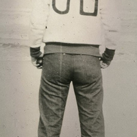 A photograph of a female Pacific University student on the beach. She is wearing a jacket with the letters JO on the back of it. There appears to be a ball in her hand. This photograph appears in an album that was compiled by Edith Hansen McGill, a 1930 Pacific University graduate.