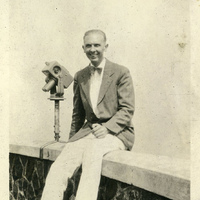 A photograph of a man sitting on the wall of a lookout. There are binoculars next to him. This could possibly be at the Vista House near Corbett, Oregon. The Vista House was built along the Columbia River Highway in 1918. The viewpoint offers breathtaking views of the Columbia River Gorge. This photograph appears in an album that was compiled by Edith Hansen McGill, a 1930 Pacific University graduate.
