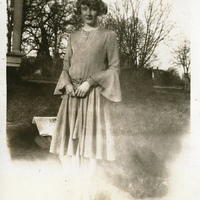 - A photograph of a female Pacific University student. She is wearing a dress and a pearl necklace. This photograph appears in an album that was compiled by Edith Hansen McGill, a 1930 Pacific University graduate.
