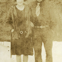 A photograph of two Pacific University students standing next to Marsh Hall after a recent snowfall on campus. The walkway they are standing on has been cleared of the snow. This photograph appears in an album that was compiled by Edith Hansen McGill, a 1930 Pacific University graduate.