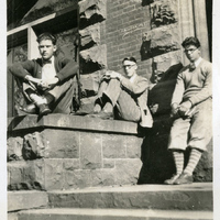 A photograph of three male students sitting or standing on the front entrance of Marsh Hall. One of the students is wearing knickerbocker style pants. Marsh Hall was built in 1895 and named after Pacific University president, Sidney Harper Marsh. Marsh Hall housed the university's chapel, recitation rooms, classrooms, administration offices and rooms for the literary societies and the Christian Associations. This photograph appears in an album that was compiled by Edith Hansen McGill, a 1930 Pacific University graduate.