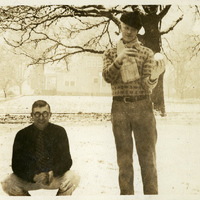 - A photograph of two male Pacific University students in the snow. One student is crouching down in the snow, while the other is holding a snowball. This photograph appears in an album that was compiled by Edith Hansen McGill, a 1930 Pacific University graduate.
