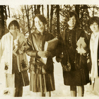 - A photograph of four female Pacific University students on campus after a recent snowfall. This photograph appears in an album that was compiled by Edith Hansen McGill, a 1930 Pacific University graduate.