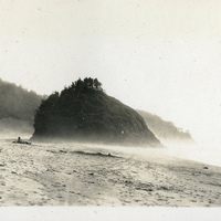 A photograph of a large rock formation on the Oregon coast known as Proposal Rock. It is located at Neskowin Beach, Oregon. This photograph appears in an album that was compiled by Edith Hansen McGill, a 1930 Pacific University graduate. For a similar print of this image, but in sepia tones, see image PUA_MS49_403.