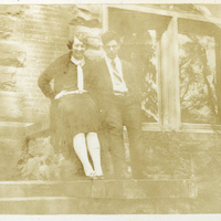 A photograph of two Pacific University students on the steps of Marsh Hall. Marsh Hall was built in 1895 and named after Pacific University president, Sidney Harper Marsh. Marsh Hall housed the university's chapel, recitation rooms, classrooms, administration offices and rooms for the literary societies and the Christian Associations. This photograph appears in an album that was compiled by Edith Hansen McGill, a 1930 Pacific University graduate.