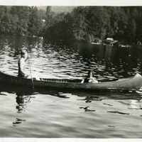 A photograph of two Pacific University students sitting in a canoe. The canoe is in an unidentified body of water. The male student is holding an oar in his hands, while the female student is posing for the camera. This photograph appears in an album that was compiled by Edith Hansen McGill, a 1930 Pacific University graduate.
