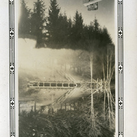 - A photograph of a forested landscape with a dock on an unidentified lake. The image is being reflected off of the water. This photograph appears in an album that was compiled by Edith Hansen McGill, a 1930 Pacific University graduate.