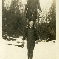 - A photograph of Pacific University student, Jessie Pool, standing on the shoulders of a fellow student. The pair are standing in a snowy, forested landscape. This photograph appears in an album that was compiled by Edith Hansen McGill, a 1930 Pacific University graduate.