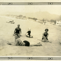 - A photograph of a group of female Pacific University students on the beach. They are wearing swimsuits and swim caps. This was most likely taken on the Oregon coast. This photograph appears in an album that was compiled by Edith Hansen McGill, a 1930 Pacific University graduate.