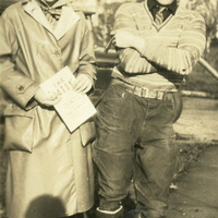 A photograph of Pacific University student, Grace Whitcomb, with a fellow student. Grace is holding a playbill for The Patsy. The Patsy was a play put on for the Pacific University homecoming in November, 1928. It was presented as an all class production and used as a fundraiser for stage equipment. It was performed in the Chapel on the evening of November 16th, 1928. This photograph appears in an album that was compiled by Edith Hansen McGill, a 1930 Pacific University graduate.
