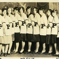 A photograph of the 1929 Pacific University Letterwoman's Club. Women earned their white sweater by receiving a thousand participation points for the sports she played. One hundred points were given for playing on a first team and fifty points for playing on the second team. The caption identifies the students as Alice Montgomery, Jacqueline Honeywell, Andrew Noble, Edith Hansen, Doris Bailey, Dora Hoffmeister, Carna Peterson, Oral Portison, Mary Santoro, Alice Palmer and Doris Madsen. This photograph appears in an album that was compiled by Edith Hansen McGill, a 1930 Pacific University graduate.