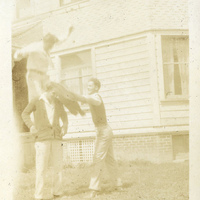 - A photograph of three male Pacific University students engaged in horseplay outside an unidentified residence. This photograph appears in an album that was compiled by Edith Hansen McGill, a 1930 Pacific University graduate