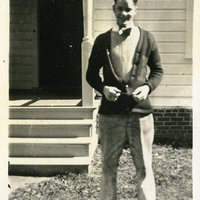 A photograph of a male Pacific University student wearing his letterman's jacket. He is standing outside of the Gamma Sigma house. The Gamma Sigma were founded in 1863 as the Gamma Sigma Literary Society at Pacific University. This photograph appears in an album that was compiled by Edith Hansen McGill, a 1930 Pacific University graduate