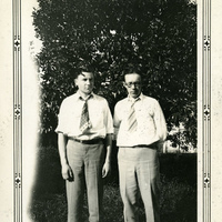 - A photograph of two male Pacific University students standing in front of a tree. This photograph appears in an album that was compiled by Edith Hansen McGill, a 1930 Pacific University graduate