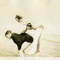 - A photograph of two Pacific University students playing leapfrog on the beach. One of the students is wearing her letterman's jacket. This was likely taken on the Oregon coast. This photograph appears in an album that was compiled by Edith Hansen McGill, a 1930 Pacific University graduate.