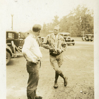 - A photograph of two unidentified men engaged in a conversation. There are several cars visible in the background. This photograph appears in an album that was compiled by Edith Hansen McGill, a 1930 Pacific University graduate.