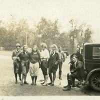 - A photograph of a group of Pacific University students dressed in Knickerbocker style pants and tall boots. There are several cars visible in the background. This photograph appears in an album that was compiled by Edith Hansen McGill, a 1930 Pacific University graduate.