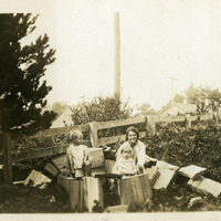 - A photograph of an unidentified woman sitting in a woodpile with two children. This was likely taken near Forest Grove, Oregon. This photograph appears in an album that was compiled by Edith Hansen McGill, a 1930 Pacific University graduate.