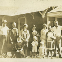 A photograph of Pacific University student, Edith Hansen McGill, standing with a group of people. Her father, Harald J. Hansen, is on the left. Edith, wearing glasses, is crouching down. They are posed next to a station in Pinehurst, Oregon: possibly a roadhouse or an old stagecoach station. This photograph appears in an album that was compiled by Edith Hansen McGill, a 1930 Pacific University graduate.