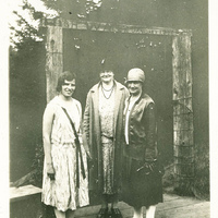 - A photograph of three unidentified women. They are standing on a wood plank walkway, under a sign that say 'Wish Water'. This photograph appears in an album that was compiled by Edith Hansen McGill, a 1930 Pacific University graduate.