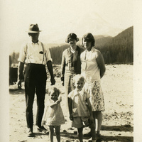 - A photograph of five people standing on the sand. This photograph appears in an album that was compiled by Edith Hansen McGill, a 1930 Pacific University graduate.