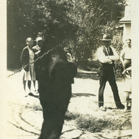 - A photograph of a black bear on a chain, standing on his hind legs. A group of spectators are gathered in the background. This photograph appears in an album that was compiled by Edith Hansen McGill, a 1930 Pacific University graduate.