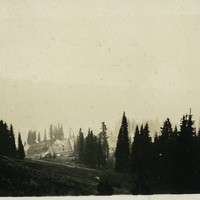 - A photograph of an elevated view of an unidentified town. There are several buildings visible through the forested landscape. This photograph appears in an album that was compiled by Edith Hansen McGill, a 1930 Pacific University graduate.