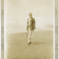- A photograph of a female Pacific University student standing on the beach, likely along the Oregon coast. This photograph appears in an album that was compiled by Edith Hansen McGill, a 1930 Pacific University graduate.
