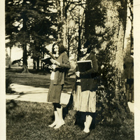 - A photograph of two female Pacific University students holding books on the campus lawn. This photograph appears in an album that was compiled by Edith Hansen McGill, a 1930 Pacific University graduate.