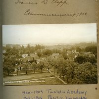 A scrapbook page that serves as an introduction for the scrapbook album compiled by Frances B. Clapp. The page contains a picture of a residential street in Forest Grove, Oregon, where Clapp attended the Tualatin Academy from 1900-1904 and Pacific University from 1904-1908. She has handwritten the dates she attended each school on this introduction page.