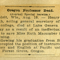 An obituary for the former Pacific University Professor of Public speaking, Henry D. Smith. Smith taught at Pacific University from 1902-1904. After that time he moved back East to teach at his alma mater, Beloit College. As well as to study in the Divinity School at Yale. He was an active member of Yale's debate team. In August of 1906 Smith drown after trying to save a young woman in Lake Geneva, New York. This obituary appears in a scrapbook compiled by Frances B. Clapp, a 1908 Pacific University graduate.