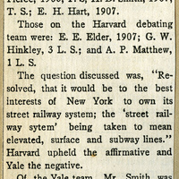 A newspaper article from the Pacific University student newspaper, The Index, titled Yale Debating Team. The article covers former Pacific University Professor of Public Speaking, Henry Smith. Smith taught at Pacific between 1902-1904. He then returned back east to continue his studies at the Divinity School at Yale. Smith was an active member of Yale's debate team. Tragically, Smith drown in 1907 in Lake Geneva, New York, trying to save a young woman in the water. This article appears in a scrapbook compiled by Frances B. Clapp, a 1908 Pacific University graduate.
