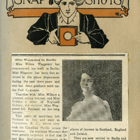 A scrapbook page titled Snapshots. The page contains a newspaper article about Pacific University student, Wilma Waggener and her trip to Berlin. Waggener was a 1904 Pacific University graduate. She studied in Berlin beginning in 1906. This page appears in a scrapbook compiled by Frances B. Clapp, a 1908 Pacific University graduate.