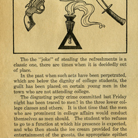 A flier that contains a skull, gun and knife. Under the image are a few paragraphs written about an incident at a Pacific University reception where refreshments were stolen by underclassmen. This flier appears in a scrapbook compiled by Frances B. Clapp, a 1908 Pacific University graduate.