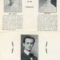 A page from the Pacific University's year book, The Heart of Oak, from the member of the faculty section. The page was most likely taken from the 1907-1908 yearbook. It includes Professor Ben Kori, Miss Yancey and Miss Bain. This page appears in an album that was compiled by Frances B. Clapp, a 1908 Pacific University graduate.