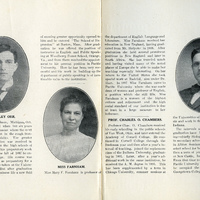A page from the Pacific University's year book, The Heart of Oak, from the member of the faculty section. The page was most likely taken from the 1907-1908 yearbook. It includes F. Wesley Orr, Professor Charles O. Chambers and Miss Mary F. Farnham. This page appears in an album that was compiled by Frances B. Clapp, a 1908 Pacific University graduate.