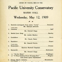 A program for a concert given in the Pacific University Conservatory on May 12th, 1909. The concert was unique in that only young men were performing, according the the University's weekly newspaper, The Index. This program appears in a scrapbook album that was compiled by Frances B. Clapp, a 1908 Pacific University graduate.