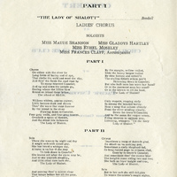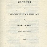 - A program for a concert given by the Pacific University Choral Union and Glee Club. The concert included performances of The Lady of Shalott and Netherland Folk Songs. This program appears in a scrapbook album that was compiled by Frances B. Clapp, a 1908 Pacific University graduate.
