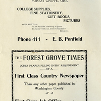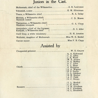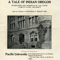 A play program from the Pacific University performance of The Bridge of the Gods. The performans was directed by Professor F. Wesley Orr. This play program appears in a scrapbook album compiled by Frances B. Clapp, a 1908 Pacific University graduate.