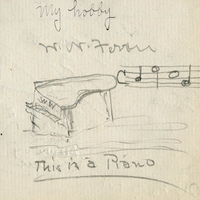 Frances B. Clapp's booklet from the Junior Reception held on January 4th, 1907. Each guest at the reception was given a blank booklet with 6 titled pages. Some of the titles included, 'my last home' and 'my hobby'. The guests were to pass around their booklet and have someone else draw what they thought the correct answer to the title was. Each artist signed their name to the illustration they drew. This booklet appears in a scrapbook album that was compiled by Frances B. Clapp, a 1908 Pacific University graduate.