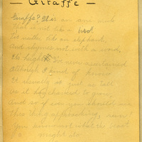A giraffe poem from an Animal Party given by Miss Sarah Bolderick on May 12th, 1905. The guests were paired up into couples and given an animal on a small piece of cardstock. The young men were to draw the animal, while the young women were to write a poem about the animal. The winners of the contest were Mr. Herman Witham and Miss Ethel Waters. This poem appears in a scrapbook album compiled by Frances B. Clapp, a 1908 Pacific University student.