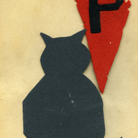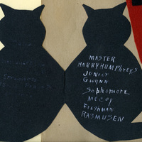 A scrapbook page from Frances B. Clapp's scrapbook, a 1908 Pacific University graduate. The page includes a Pacific University pennant and a black cat Halloween invitation. The inside of the invitation list the Pacific University students Harry Humphreys, William Gwynn, Horace McCoy and Jennie Rasmusen as the hosts. The Halloween party was held in the attic of Herrick Hall on October 31st, 1908. This page appears in a scrapbook compiled by Frances B. Clapp, a 1908 Pacific University graduate.