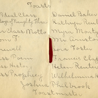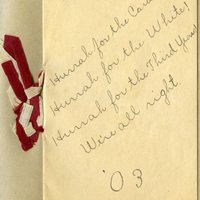 An invitation for the Tualatin Academy graduation for the class of 1903. The invitation has the class yell on the front. It contains a schedule of events, as well as a menu. The invitation appears in a scrapbook compiled by Frances B. Clapp, a 1908 Pacific University graduate.