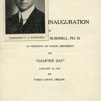 A program from Pacific University's President, Charles Bushnell's, inauguration. The inauguration took place on January 14th, 1914, after the resignation of President William Ferrin. The inauguration guests included nine other university presidents, including the presidents from the University of Oregon and Oregon State University. The festivities ended with a bonfire on campus. This program appears in a scrapbook compiled by Frances B. Clapp, a 1908 Pacific University graduate.